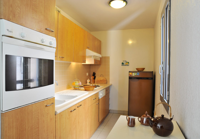 * une cuisine entièrement équipée avec plaque cuisson 4 feux électriques, un réfrigérateur, un four électrique, un lave-vaisselle, le matériel de cuisine pour 6 personnes.